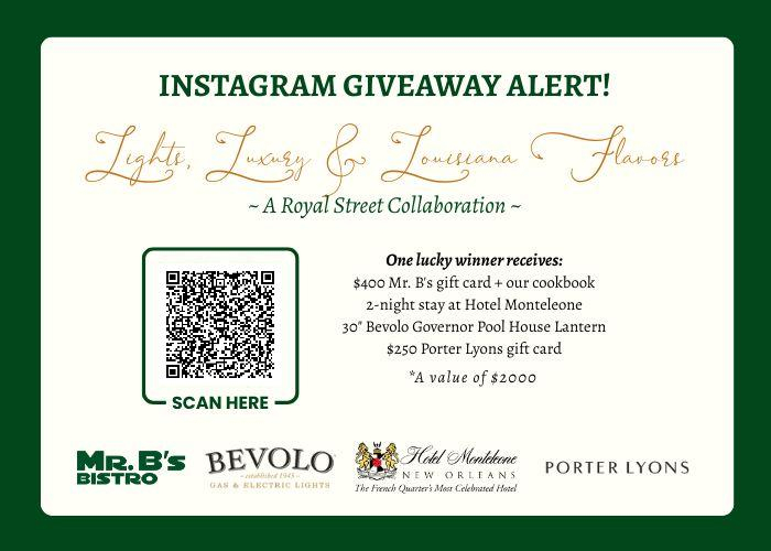 Free Design ServiceWe’re spreading holiday cheer with the ultimate French Quarter experience—featuring gifts from some of Royal Street’s finest! Enter for your chance to win a dining experience with Mr. B's Bistro, signature jewelry from Porter Lyons, a luxury stay at Hotel Monteleone, and a handcrafted Bevolo Pool House Lantern.