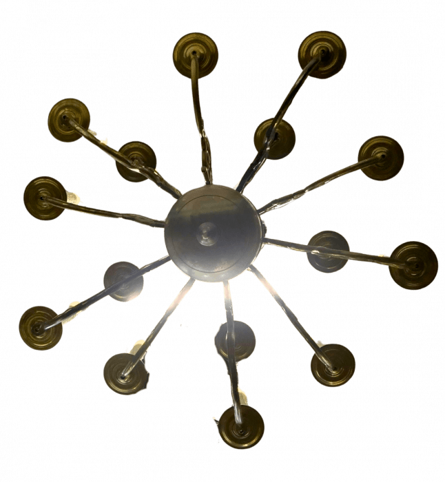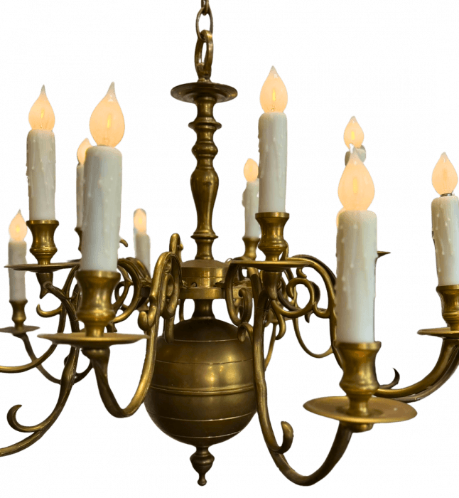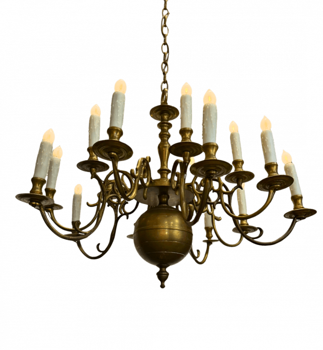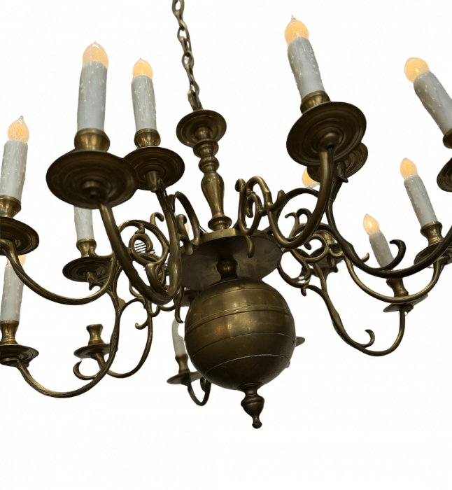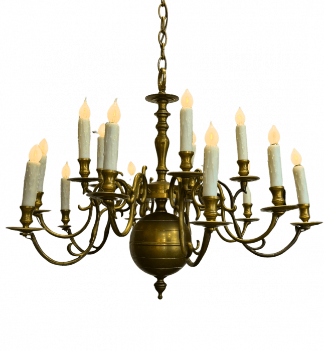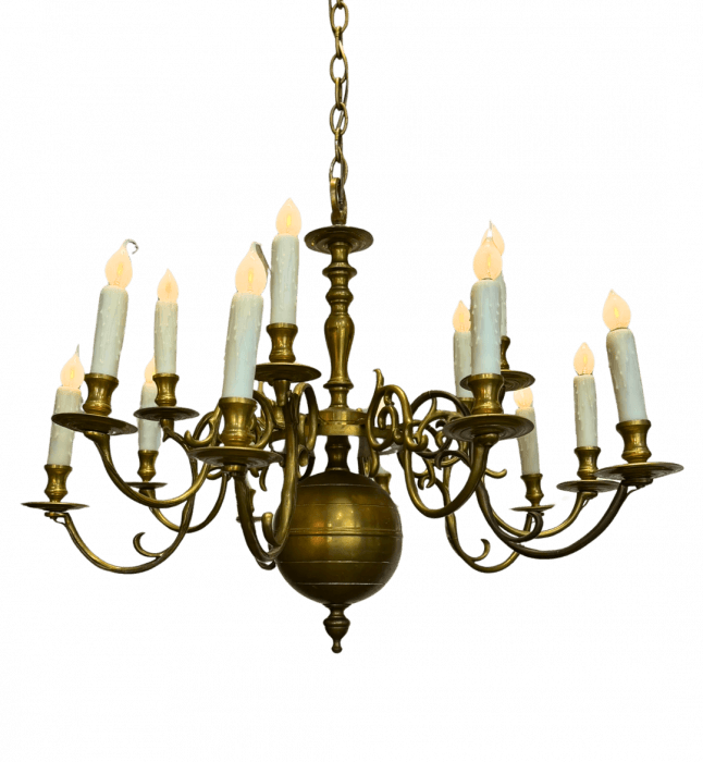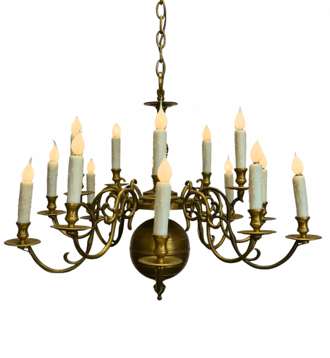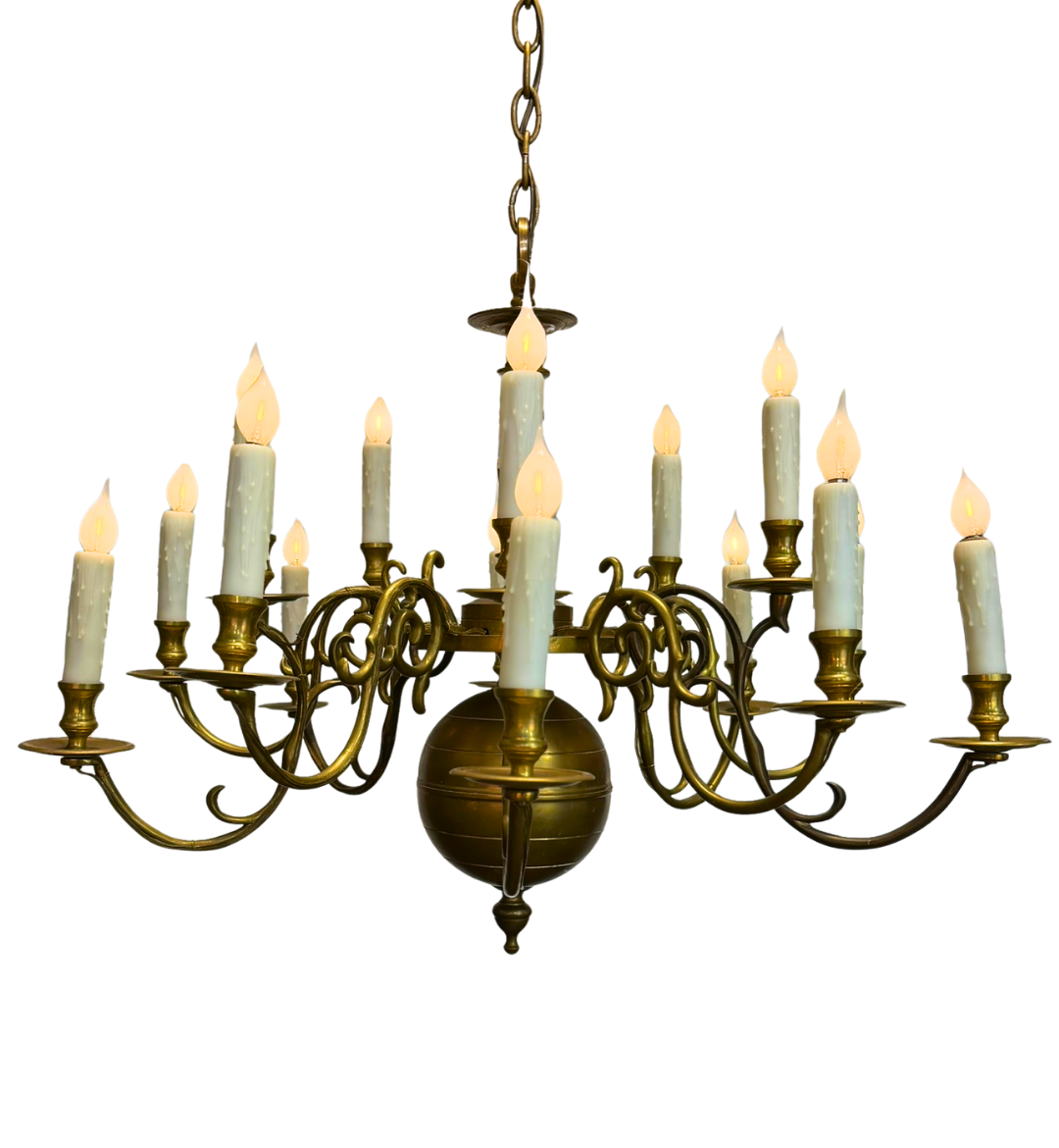 This vintage early 20th century English brass chandelier is in the Colonial Williamsburg style, which is easily recognized by its large central ball and deeply scrolling arms. The fixture features 8 arms, half of which have two tiers of candelabra sockets and the other half with one candelabra socket, for a total of 15 sockets. It is a very heavy and substantial chandelier that would look lovely in a classic dining room or entryway. Weighs 55 lbs. Read Less