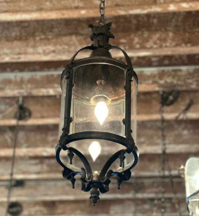 Substantial French, pendant light with curved glass supported by a brass patina frame. This lantern features... Read More