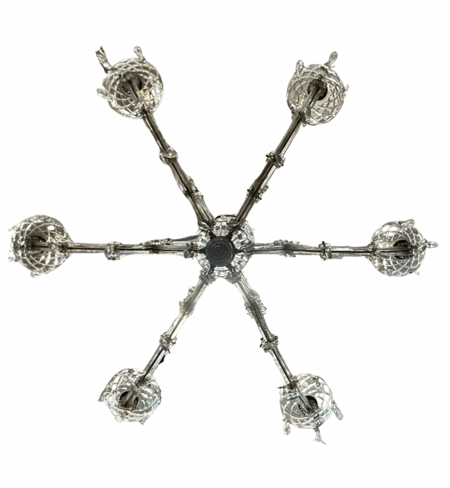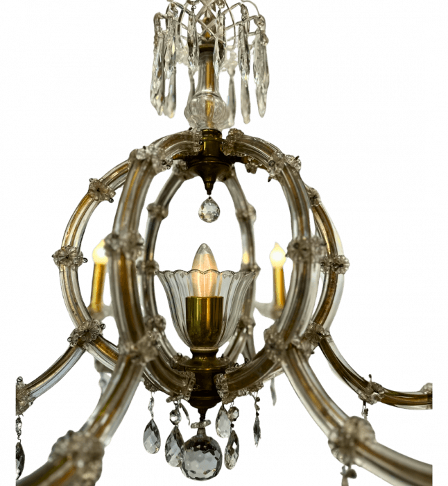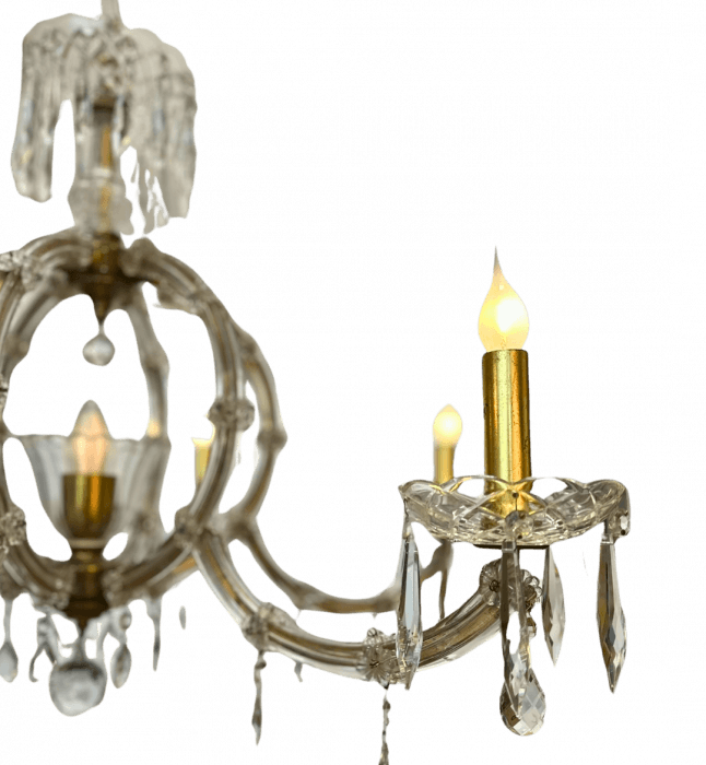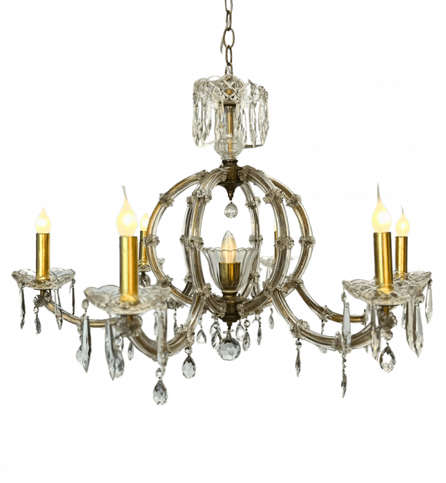 Traditional vintage Maria Theresa chandelier draped with cut crystals featuring six wrapped crystal arms with candelabra sockets. Central medium socket sits in the middle of the rounded birdcage center. Read Less