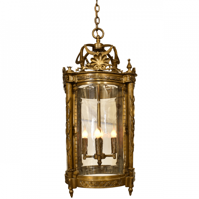 Elegant, round, French Quince hanging pendant with etched curved glass and intricate brass filigree at the lantern top and bottom. Wood rods with intricate brass detailing line each of the four sides. Place this fixture in an open foyer to graciously great guest. Read Less