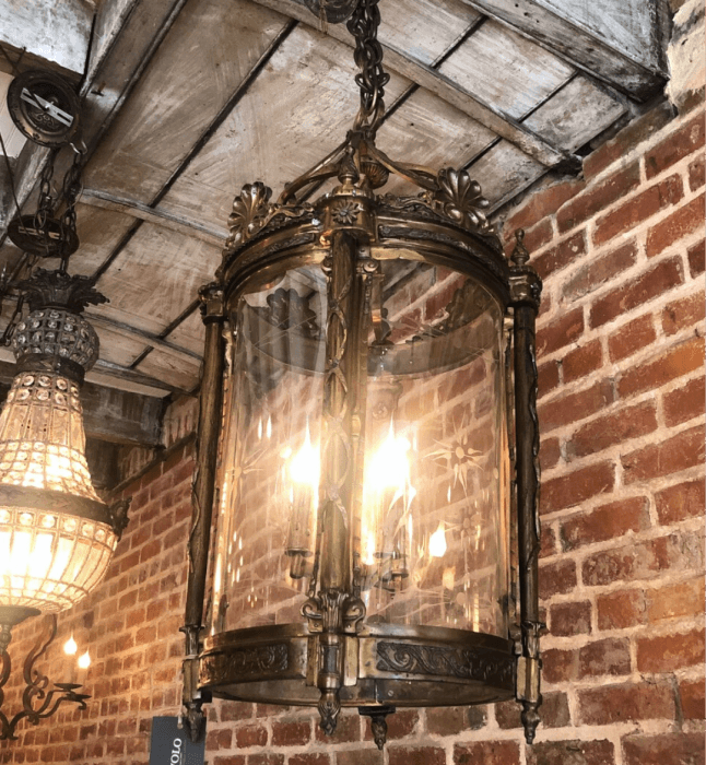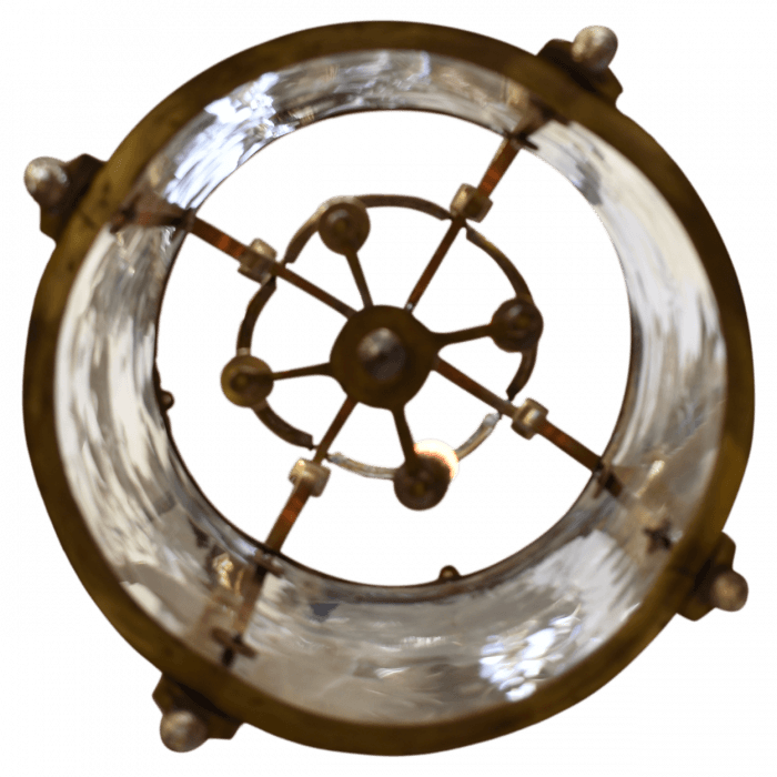 Vintage French Quince Round Brass Lantern with Etched Glass and Wood Rod Detailing