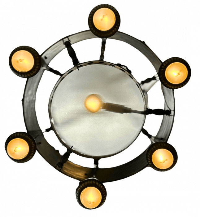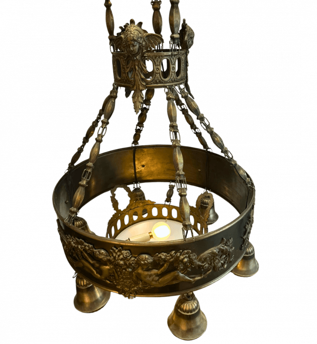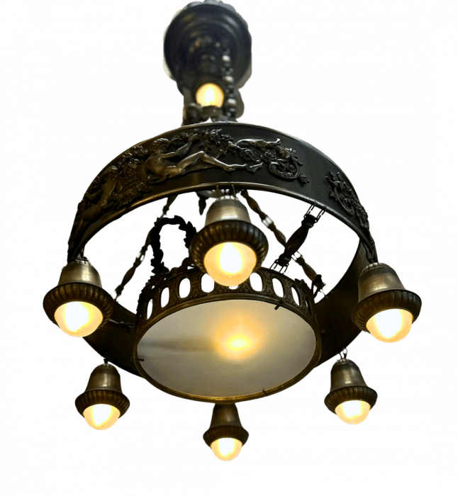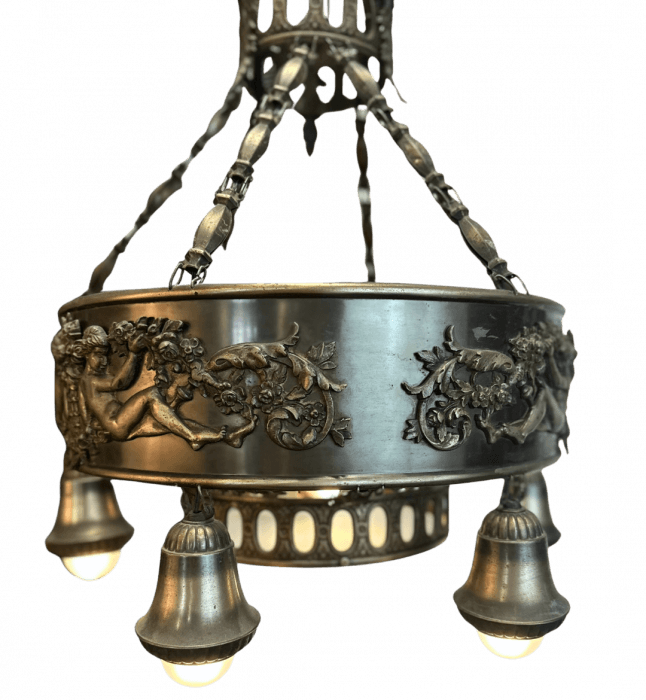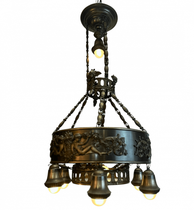 Large ornate vintage Art Deco style chandelier featuring a patinated, pressed metal finish and classical detailing, including sculpted cherubs and floral motifs around the circular frame. Six downward-facing sockets with bell-shaped covers encircle the base, while an additional bulb in center or plus one suspended in the center, for a total of 8 lights. The chandelier hangs from a decorative chain assembly, giving it an antique and elegant presence. Read Less