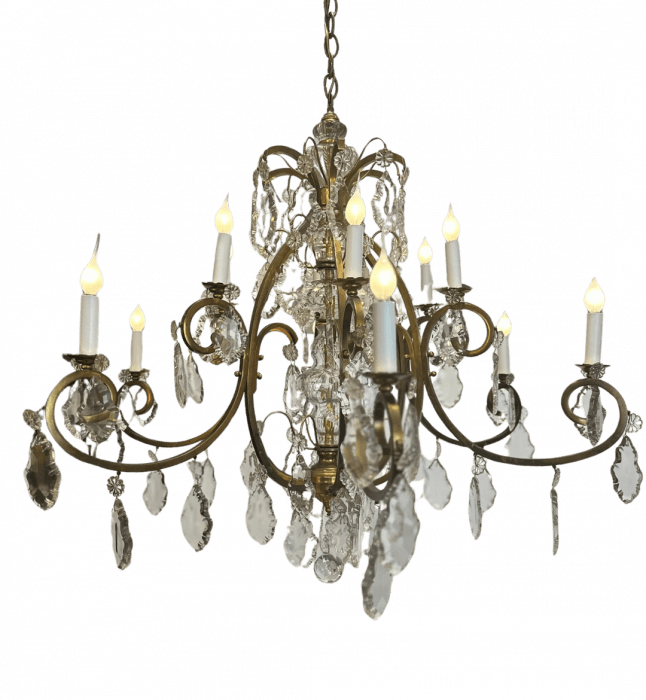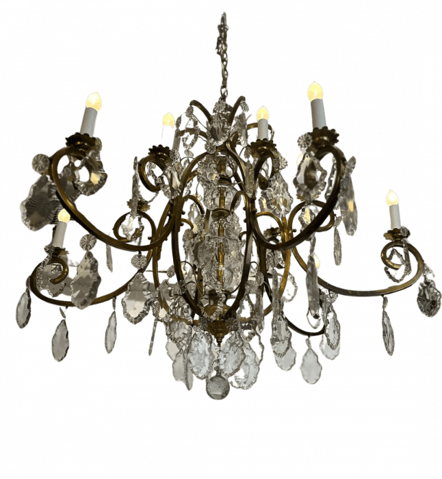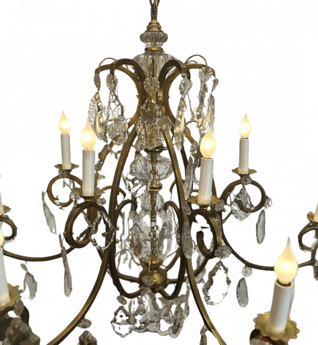 This ornate brass chandelier features a six-arm birdcage design, each arm holding two candelabra sockets on each. Crystal prisms and drops cascade throughout, reflecting light for an opulent sparkle. Its intricate scrollwork and vintage elegance make it a striking centerpiece for a luxurious interior. Read Less