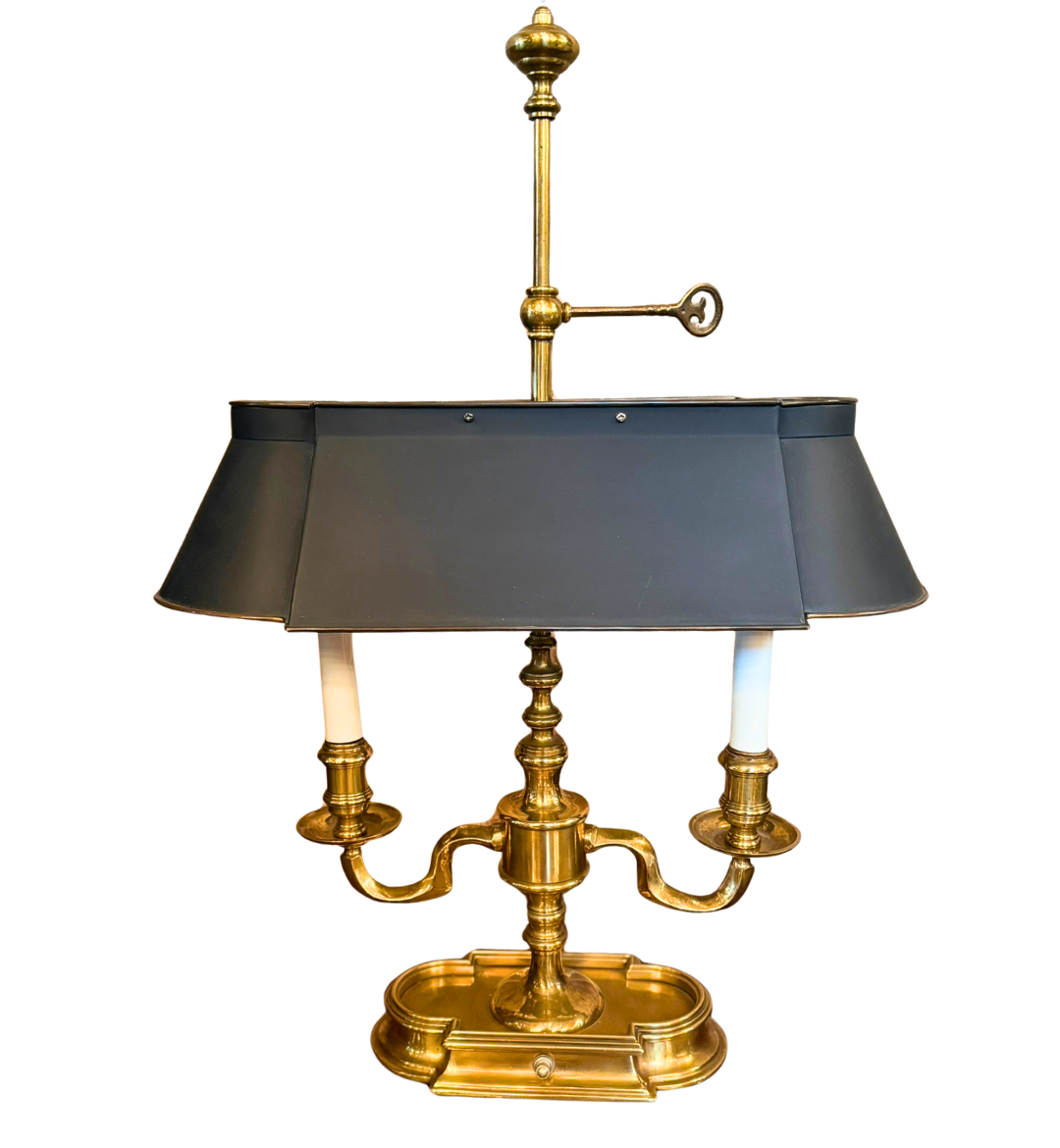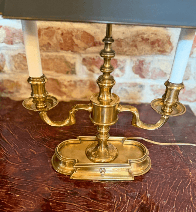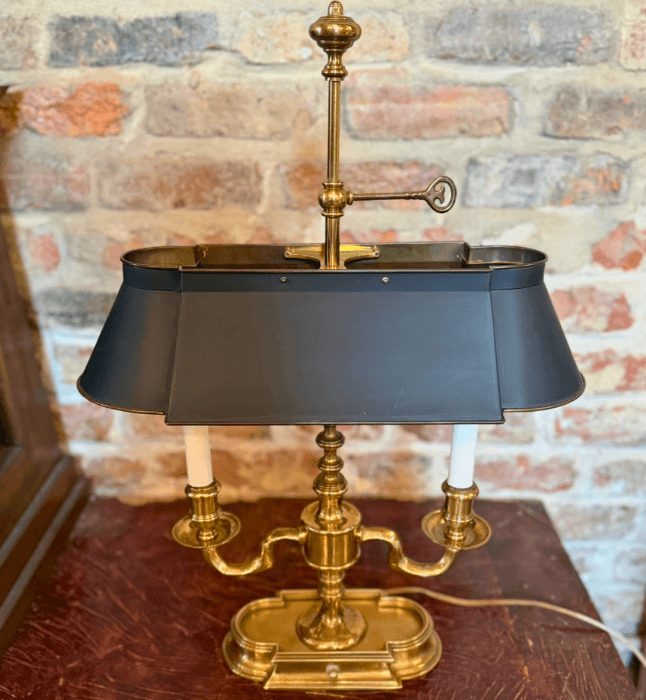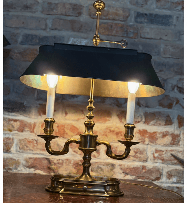 Vintage Brass Bouillotte Table Lamp by Frederick Cooper with Long Black Tole Metal Shade shielding 2 Candelabra Arms Below. The Bouillotte lamp originated in the 18th century for a French card game called Bouillotte, a precursor to poker. These lamps feature a brass or bronze base with 2-4 candle arms and an adjustable metal tole shade that moved down as the candles burned down to reduce glare. Read Less