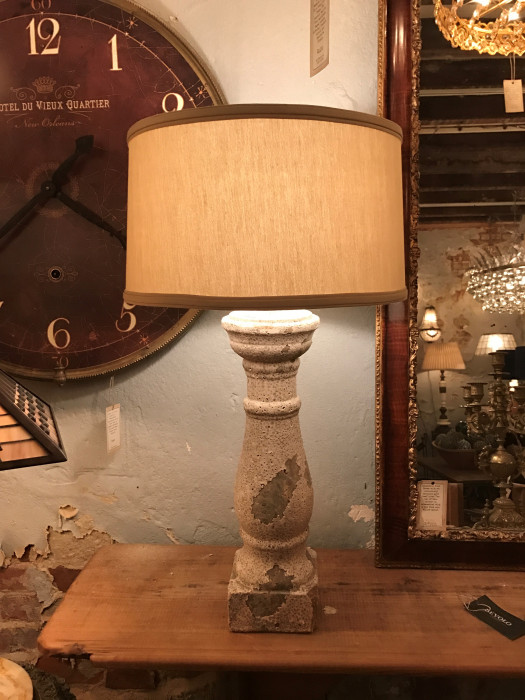 European Crackled White and Stone Table Lamp with Beige Drum Shade - 24.5"h to socket, Shade: 9"h x 16"od