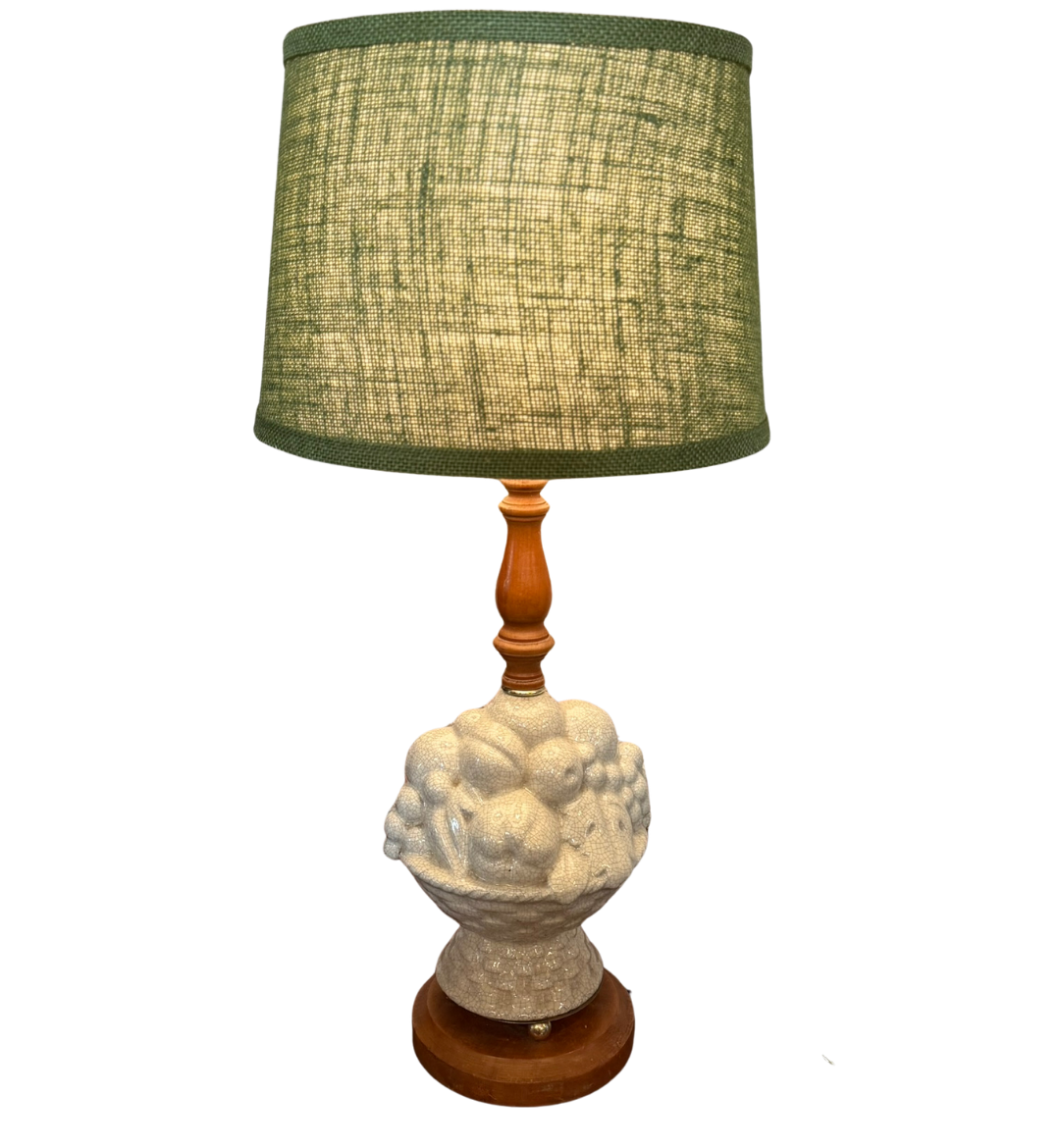 This vintage table lamp features a white fruit basket in white crackle stone ceramic and a tall turned wood neck. Brass details and a garden green shade finish the look. Two available. Read Less