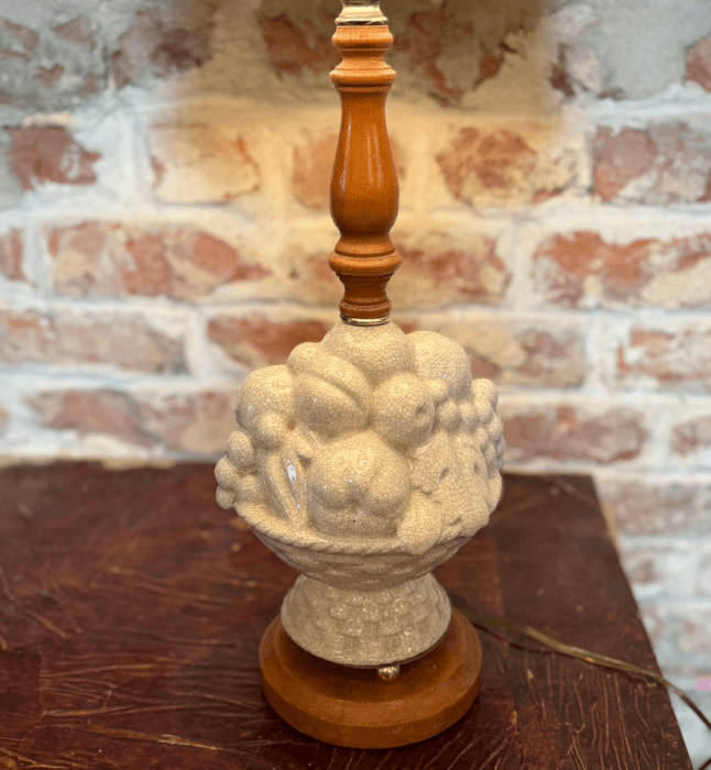This vintage table lamp features a white fruit basket in white crackle stone ceramic and a tall turned... Read More