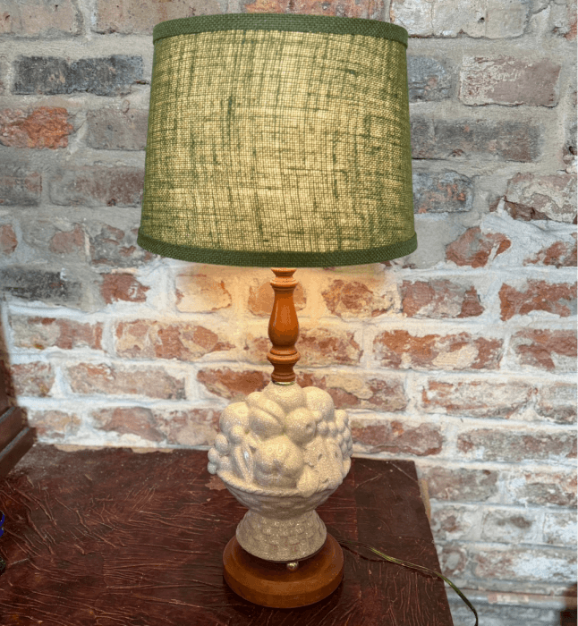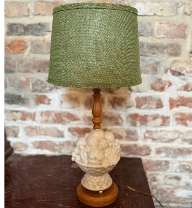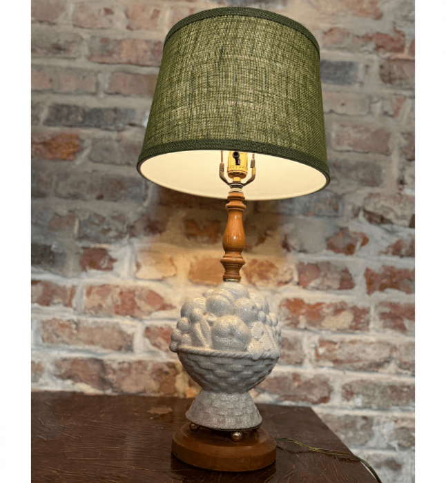 Vintage Fruit Basket Table Lamp with Green Burlap Shade