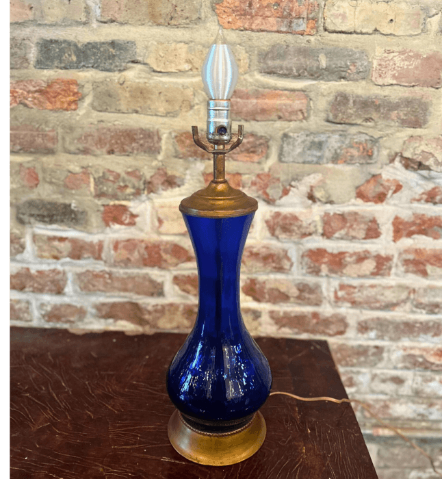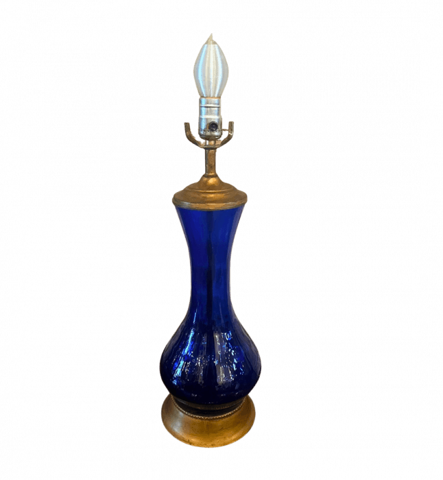 This vintage cobalt blue glass table lamp is handblown in a Blenko style genie bottle shape with brass... Read More