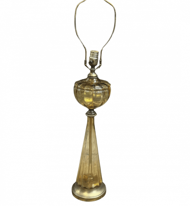 This vintage table lamp features a honey-colored Murano glass base with a fluted, tapered column and a globe-like midsection. Accented with brass-toned hardware, it exudes a warm, atomic-era aesthetic. Its elegant silhouette and rich amber hue make it a standout piece for retro or eclectic interiors. Shade sold separately. Read Less