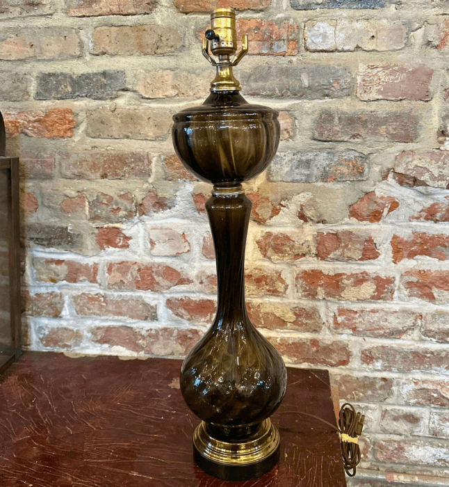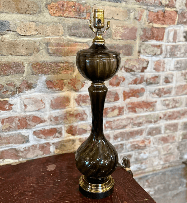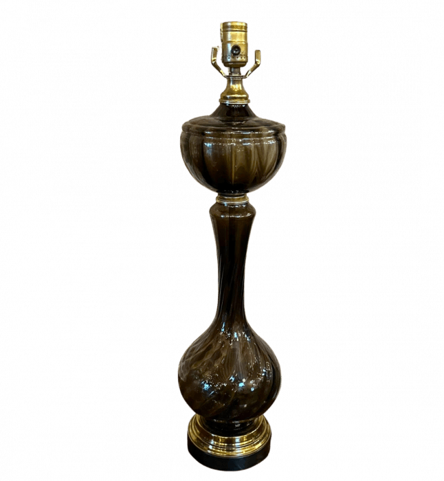 This vintage Mid-Century Modern table lamp is made of handblown Empoli glass from Italy. The smoke grey color glass features an optic swirl and the atomic shape and brass accents will add unique feel to any space. Shade sold separately. Read Less