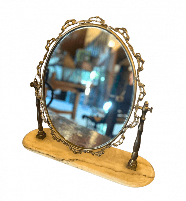 Vintage Italian Brass Vanity Mirror featuring Marble Base and 2 Column Legs