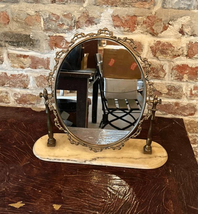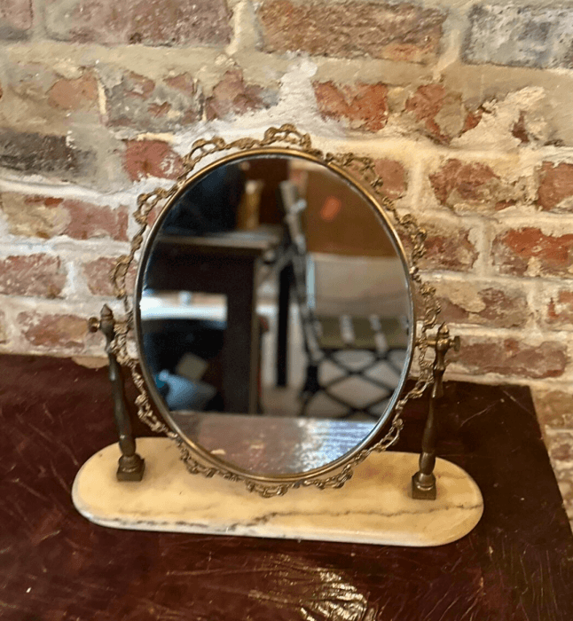 Vintage Italian Brass Vanity Mirror featuring Marble Base and Two Brass Column Legs. This beautiful oval... Read More