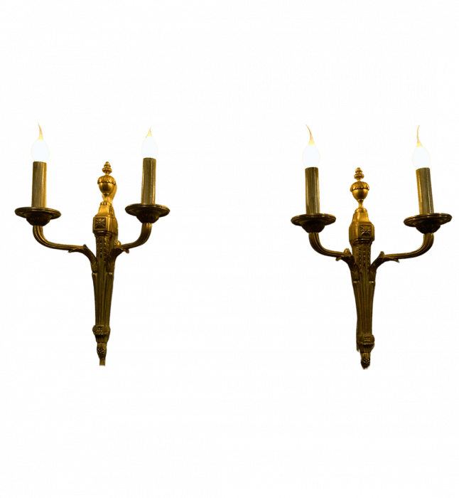 Vintage French Empire brass wall sconce with two arms featuring candelabra sockets. The fixture features ornate detailing, including a central finial and decorative patterns on the arms and base. Its antique-inspired design evokes a classic, elegant ambiance suitable for traditional interiors. Multiple available. Read Less