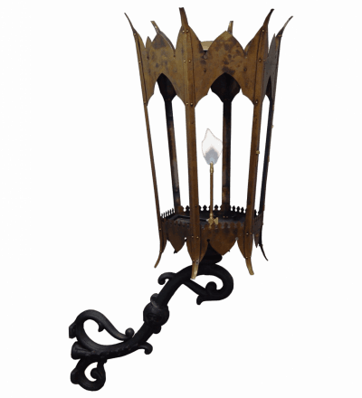 The Gothic lantern is characterized by its sharp, striking lines. It has been used on churches, commercial businesses, and homes alike. This light is especially dramatic when used in conjunction with the Commander’s Palace bracket. It is available in natural gas, liquid propane, and electric.