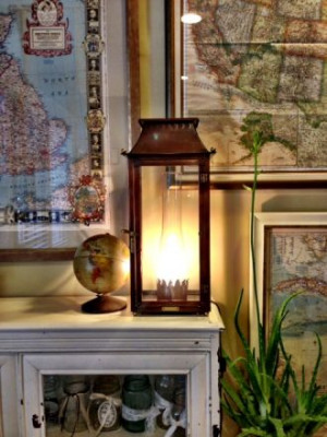 We are enjoying our Bevolo lamp in our home. Every time we turn it on we are reminded of our wonderful trip to New Orleans. It's the best souvenir that anyone could hope to bring back. Here are a couple of photos of the lamp living side by side the other things we've collected during our travels, including Chelou our rescue dog that we brought home from the streets of St Lucia.