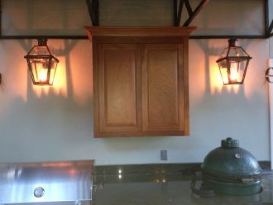 I can't remember if I ever sent you photos of my new Outside Grill (gas grill and Green Egg). Here are 2 photos with the Bevolo Lanterns. Thanks for all your help!